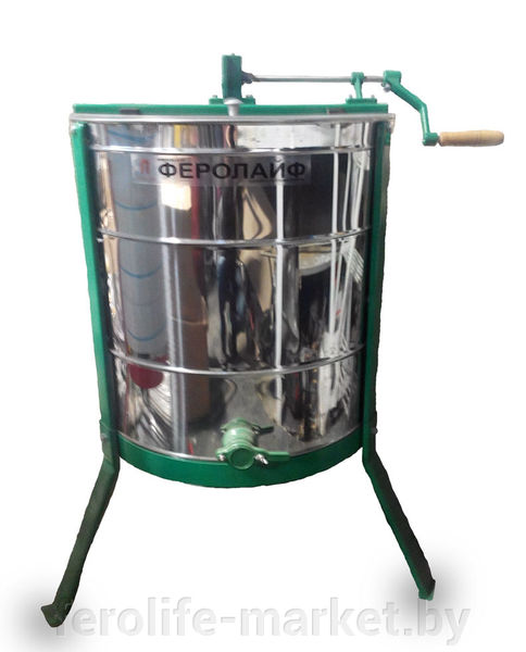 Описание 1.Медогонка 4х-рамочная необоротная из нержавеюшей стали AISI 430. Рамки с ПВХ покрытием, держатели из нержавеющей стали. 2.Редукторный привод (ручной). Редуктор с обгонной муфтой и тормозом производства Сербии.Полностью металлический. 3. Подставка для медогонки (ножки). 4.Пластиковый кран.